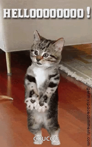 Descrierea conținutului: a kitten is standing on its hind legs and says hello .