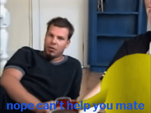 a man in a black shirt is sitting in front of a sign that says nope can t help you mate