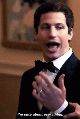 Descrierea conținutului: a man in a tuxedo is clapping his hands and says `` i 'm cute about everything '' .