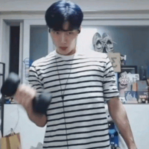 Descrierea conținutului: a man in a striped shirt is holding a dumbbell in his hand .