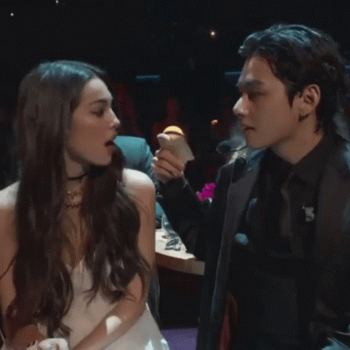 Descrierea conținutului: a man in a suit is holding a piece of paper next to a woman in a white dress