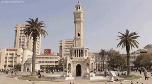 Descrierea conținutului: a clock tower in a city with a flag in the background that says c.