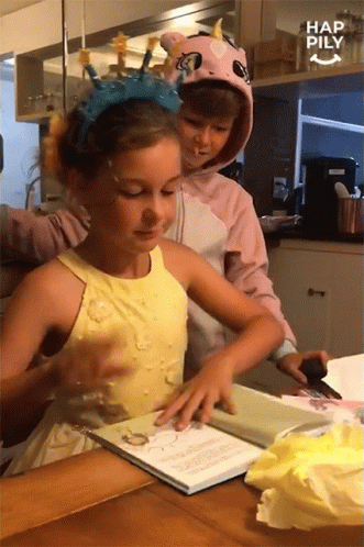 - Descrierea conținutului: a girl in a yellow dress is reading a book while a boy in a pink unicorn hoodie is cutting a piece of paper