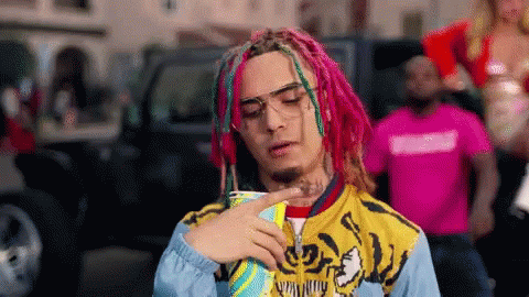 Descrierea conținutului: a man with pink dreadlocks and glasses is pointing at something
