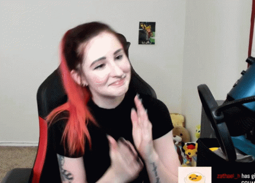 Descrierea conținutului: a woman with red hair is sitting in a chair in front of a sign that says zathael_hs