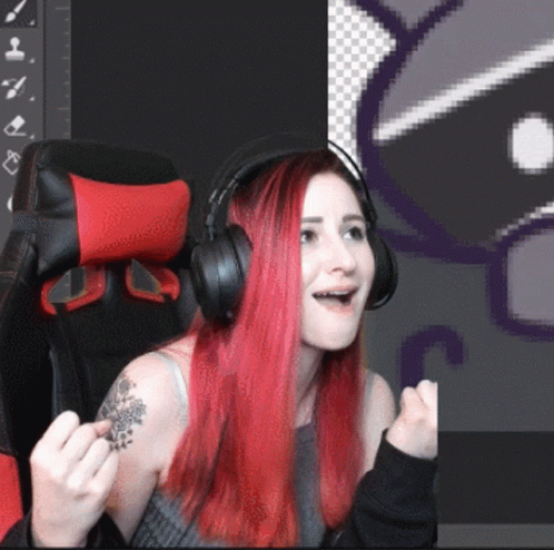 Descrierea conținutului: a woman with red hair is wearing headphones in front of a computer screen