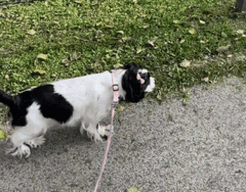 Descrierea conținutului: a black and white dog on a leash looking at something