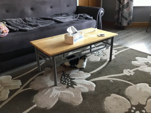 Descrierea conținutului: a box of facial tissues sits on a wooden table next to a cat