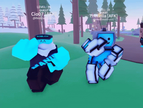 - Descrierea conținutului: a screenshot of a video game shows a blue robot and a white robot standing next to each other