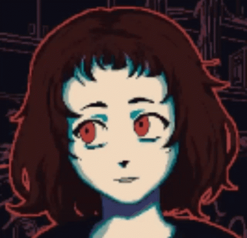 Descrierea conținutului: a pixel art drawing of a girl with red eyes and brown hair