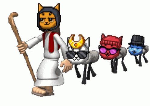 Descrierea conținutului: a cartoon of jesus holding a cane and three sheep wearing hats