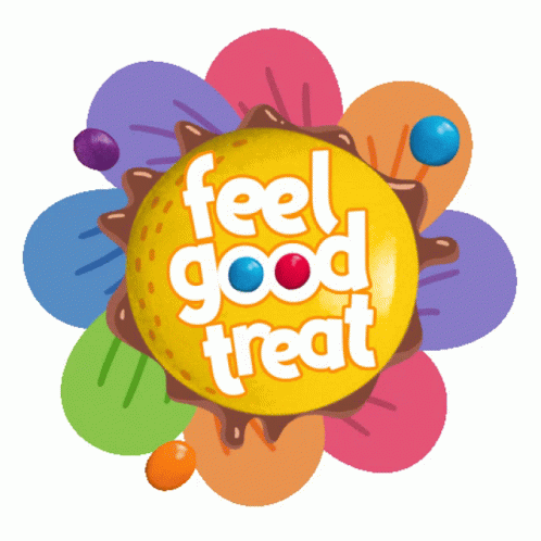 Descrierea conținutului: a colorful flower with a yellow circle that says " feel good treat "