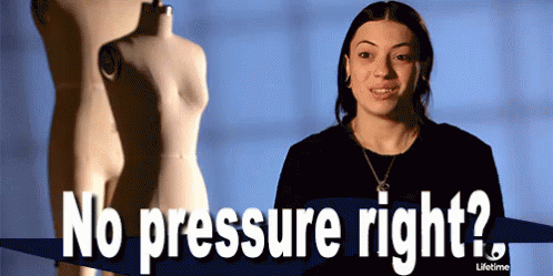 Descrierea conținutului: a woman stands in front of a mannequin with the words " no pressure right " on the bottom