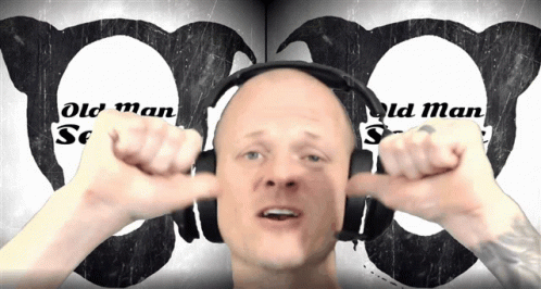 Descrierea conținutului: a bald man wearing headphones with the words old man sc on the bottom