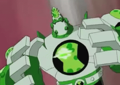 - Descrierea conținutului: a cartoon character from ben 10 is standing in front of a red background and looking at the camera .