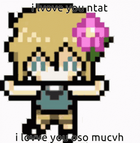 Descrierea conținutului: a pixel art of a girl holding a pink flower with the words i love you ntat