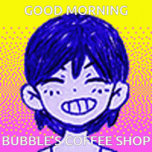 Descrierea conținutului: a drawing of a boy with blue hair is smiling and says good morning bubble 's coffee shop .