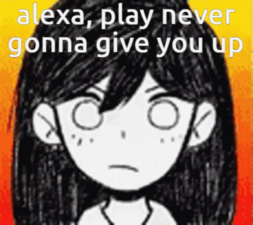 Descrierea conținutului: a black and white drawing of a girl with the words alexa play never gonna give you up above her