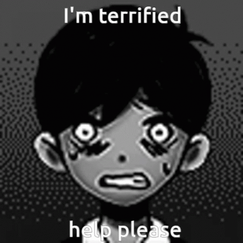 Descrierea conținutului: a black and white drawing of a boy with big eyes and the words i 'm terrified help please .