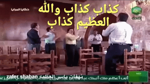 Descrierea conținutului: a group of men are dancing in a restaurant with arabic writing on the bottom