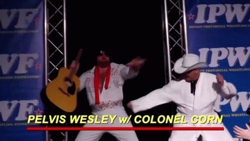 Descrierea conținutului: a man in a elvis costume holds a guitar in front of a banner that says ipw