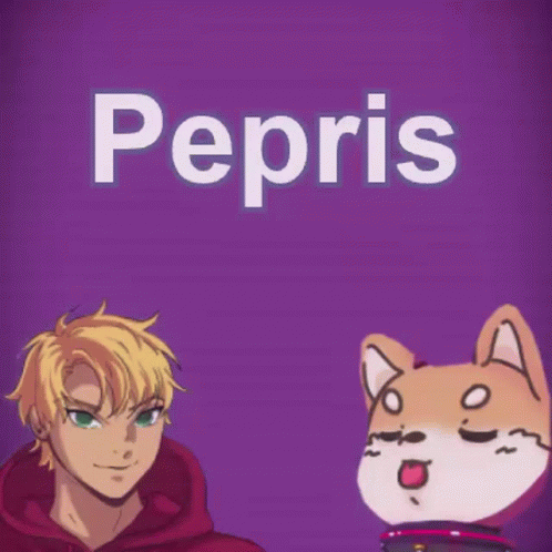 - Descrierea conținutului: a boy and a dog are standing next to each other on a purple background with the word pepris written on it .