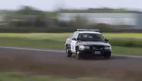 Descrierea conținutului: a police car is driving down a road with a field in the background .