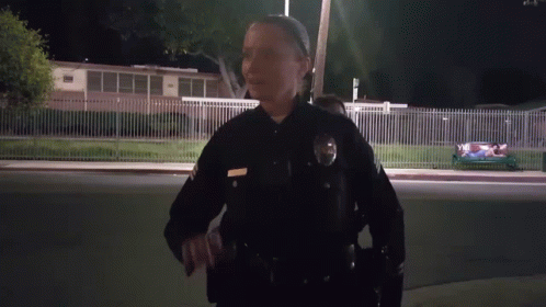 Descrierea conținutului: a female police officer stands in front of a fence and a building at night
