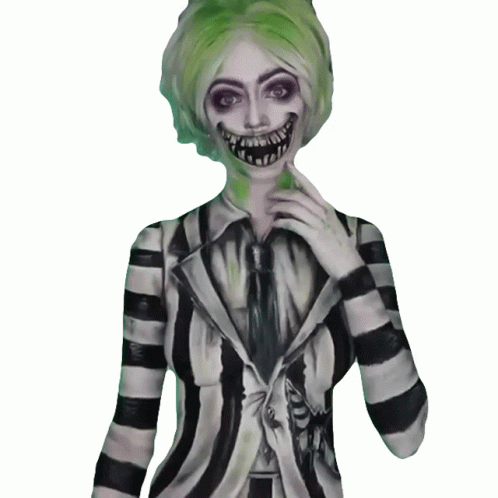 Descrierea conținutului: a woman with green hair and black and white stripes on her body is dressed as beetlejuice