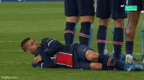 Descrierea conținutului: a soccer player is laying on the field with a group of players behind him