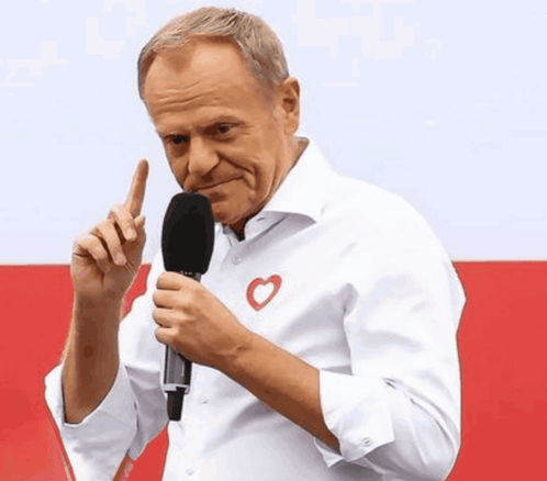 Descrierea conținutului: a man in a white shirt with a red heart on his chest is holding a microphone