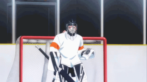 Descrierea conținutului: a hockey goalie wearing a helmet and gloves stands behind a net