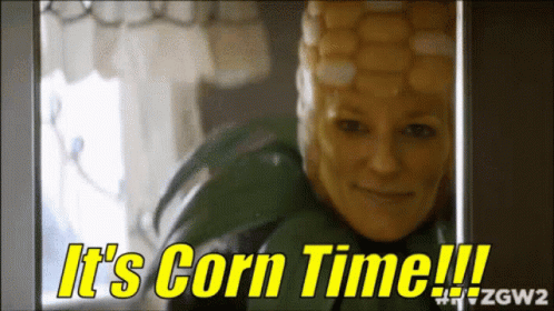 Descrierea conținutului: a woman in a corn on the cob costume says " it 's corn time "