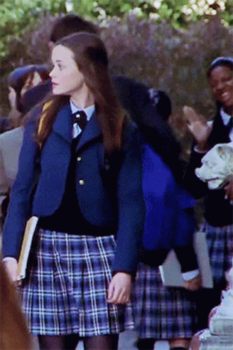 Descrierea conținutului: a girl in a blue jacket and plaid skirt stands in a crowd of people