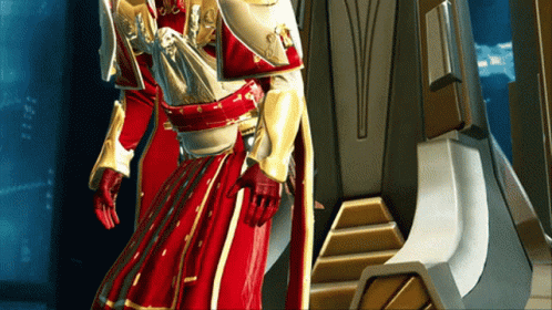 Descrierea conținutului: a man in a red and gold costume stands in front of a building