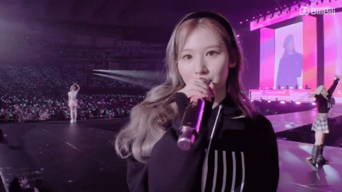 Descrierea conținutului: a woman singing into a microphone on a stage with a blurry background
