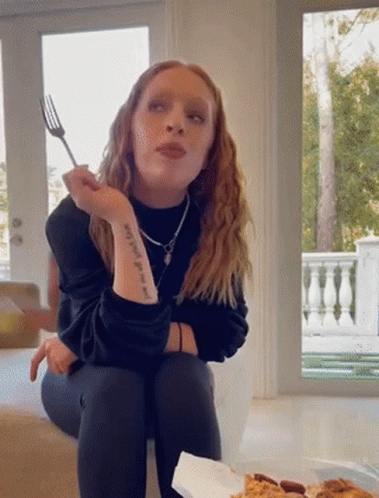 Descrierea conținutului: a woman with a tattoo on her arm that says " i am not a fool " is holding a fork