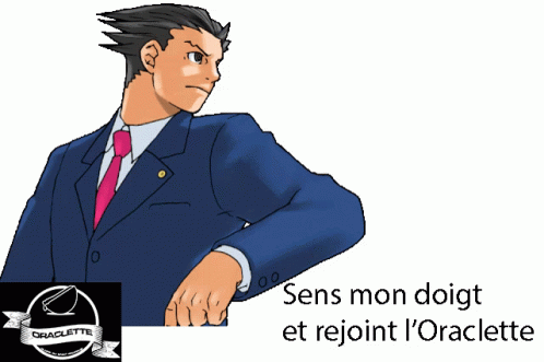 Descrierea conținutului: a cartoon of a man in a suit pointing with the words sens mon doigt et rejoint l' oraclette below him