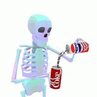 Descrierea conținutului: a skeleton is pouring a can of coke from a pepsi cup .