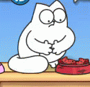 Descrierea conținutului: a cartoon cat is sitting on a wooden table next to a red bowl of food .