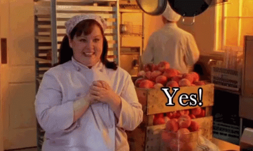 Descrierea conținutului: a woman in a chef 's uniform is standing in front of a crate of apples and says yes .