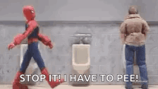 Descrierea conținutului: a man in a spiderman costume is walking next to a man in a urinal .