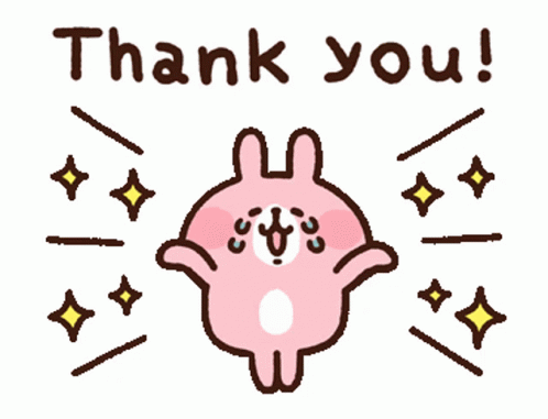 Descrierea conținutului: a thank you sticker with a pink bunny and yellow stars