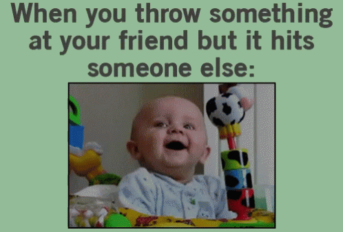 - Опис на содржините: a baby is smiling while playing with toys and the caption says when you throw something at someone but it hits someone else