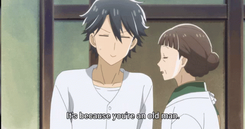 Опис на содржините: a man and a woman are standing next to each other and the man is saying it 's because you 're an old man