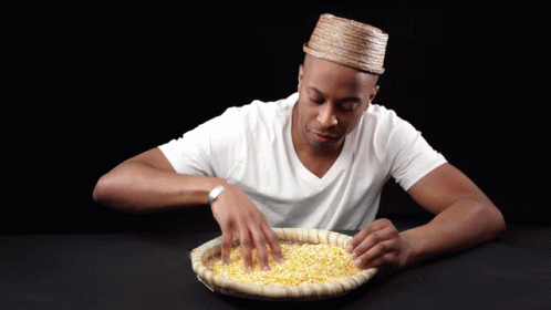 Опис на содржините: a man wearing a straw hat reaches into a basket of corn