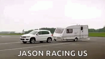 Опис на содржините: a car is towing a trailer on a road with the words jason racing us below it