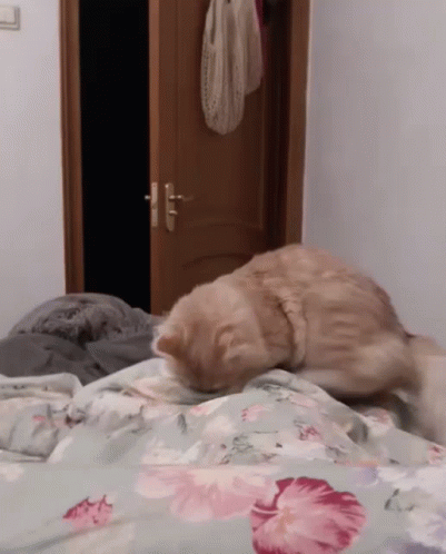 Опис на содржините: a cat laying on top of a bed with a floral blanket