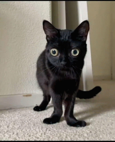 Опис на содржините: a black cat with big eyes is standing on a carpet