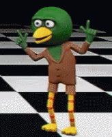 Опис на содржините: a green duck mascot is standing on a checkered floor giving the middle finger